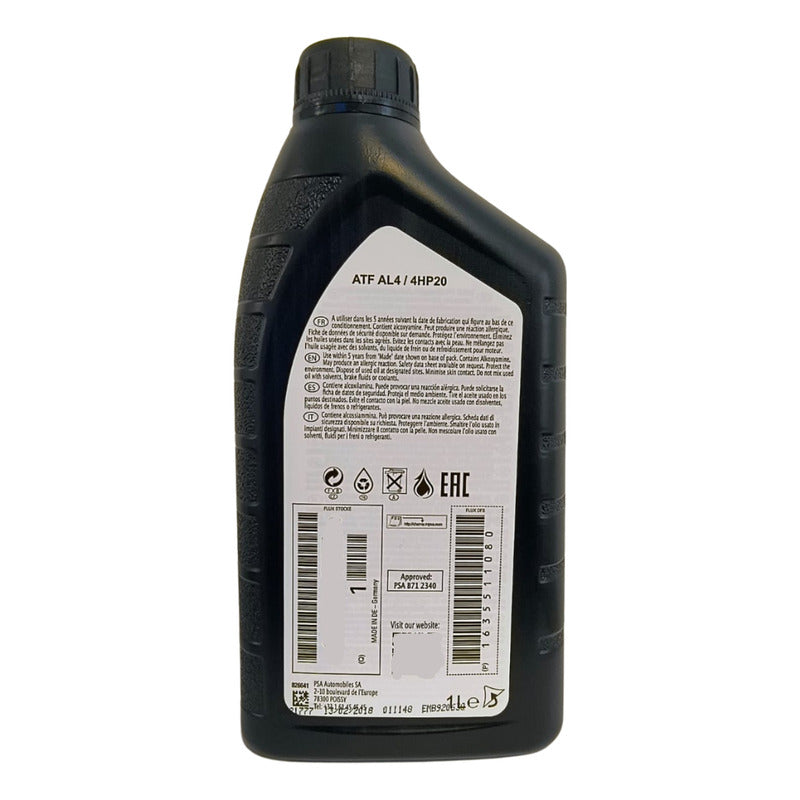 Aceite de transmisión automática formulado específicamente para cajas AL4 y 4HP20 utilizadas en vehículos Peugeot y Citroën, garantizando cambios suaves y protección óptima del sistema hidráulico.