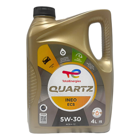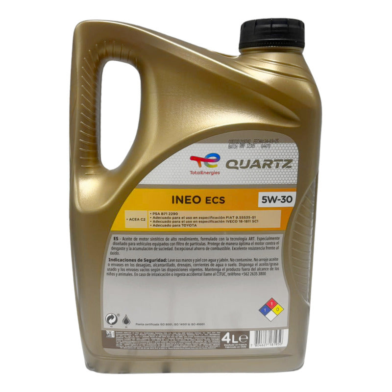 Aceite de motor sintético TOTAL QUARTZ INEO ECS 5W-30 en envase de 4 litros, desarrollado para ofrecer un alto rendimiento y máxima protección en motores modernos diésel y gasolina, especialmente aquellos equipados con filtro de partículas (DPF). Su formulación incorpora tecnología ART y LOW SAPS, lo que reduce la formación de residuos, protege los sistemas de postratamiento y contribuye a un funcionamiento más limpio y eficiente del motor.