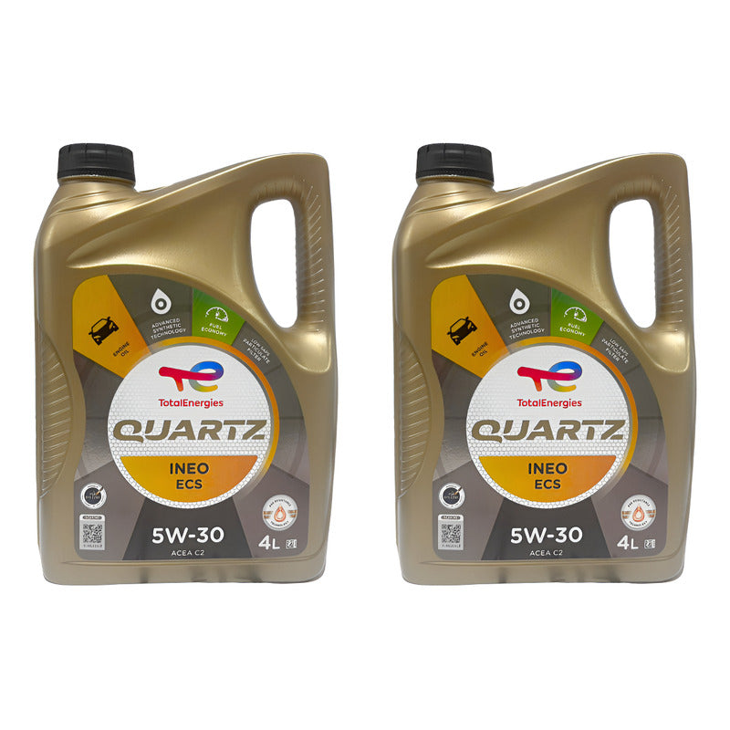 Pack de 2 bidones de aceite TOTAL QUARTZ INEO ECS 5W-30 de 4 litros cada uno (8 litros en total), lubricante sintético de alto rendimiento desarrollado por TotalEnergies para motores modernos diésel y gasolina, especialmente aquellos equipados con filtro de partículas (DPF).