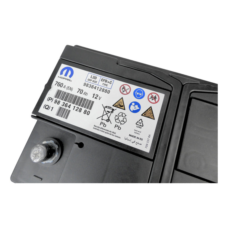 Batería original PSA de 12V y 70Ah diseñada específicamente para vehículos equipados con sistema Stop&Start, garantizando un arranque confiable incluso en condiciones de alta demanda eléctrica. Su elevada corriente de arranque en frío de 760 A permite encendidos rápidos y estables, mientras que su tecnología con electrolito líquido asegura una entrega de energía constante y una mayor durabilidad frente a ciclos frecuentes de carga y descarga. Fabricada bajo estándares originales PSA GROUPE, ofrece compatibilidad total con la gestión electrónica del vehículo y es ideal tanto para reemplazos correctivos como mantenciones preventivas.